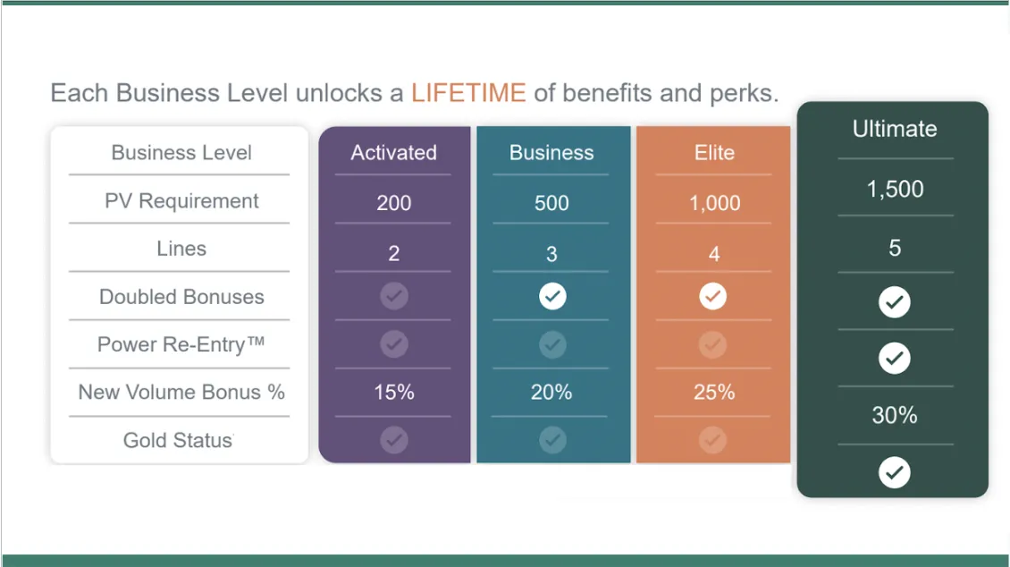 The higher your business level, the larger the bonus you earn on new volume sales.